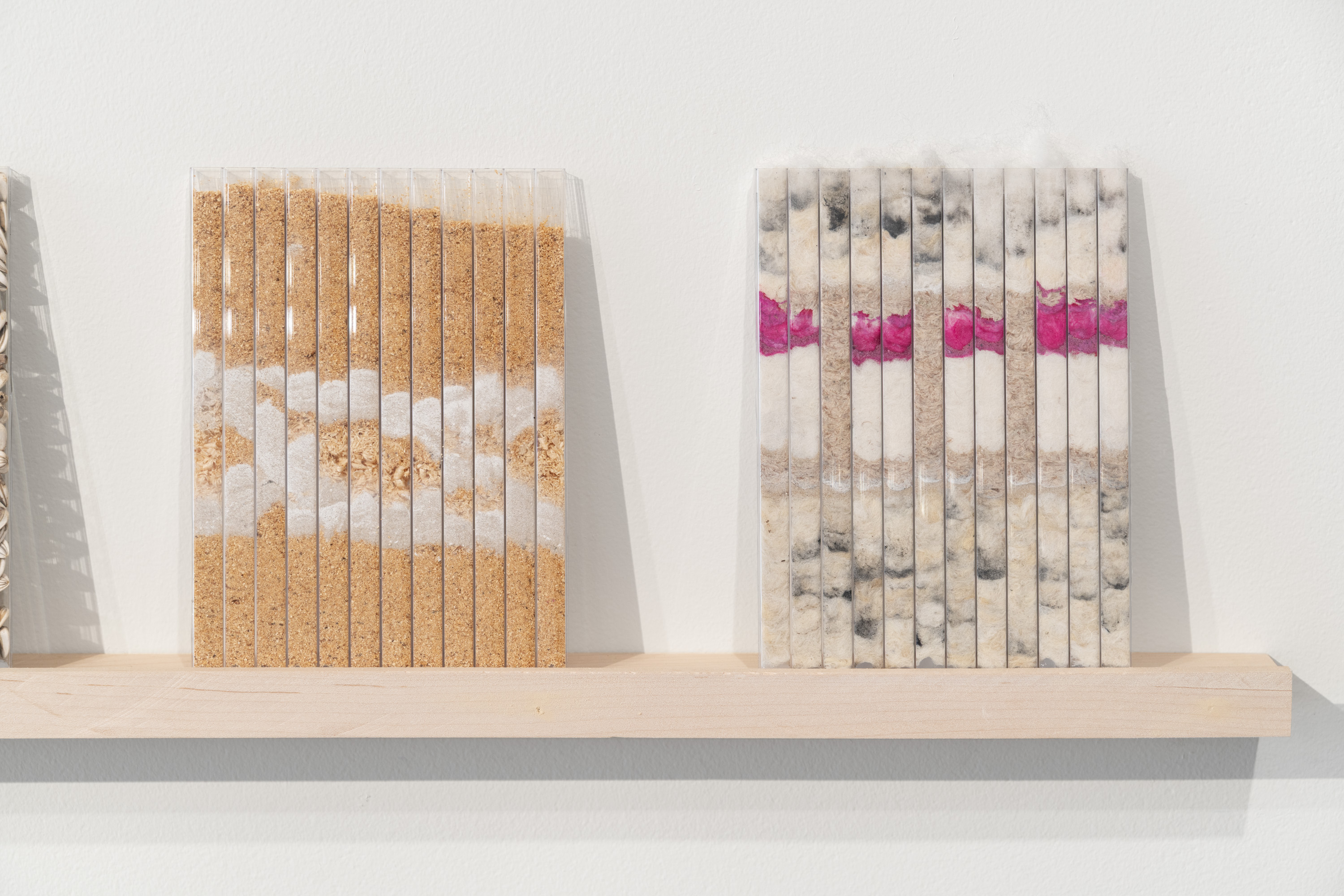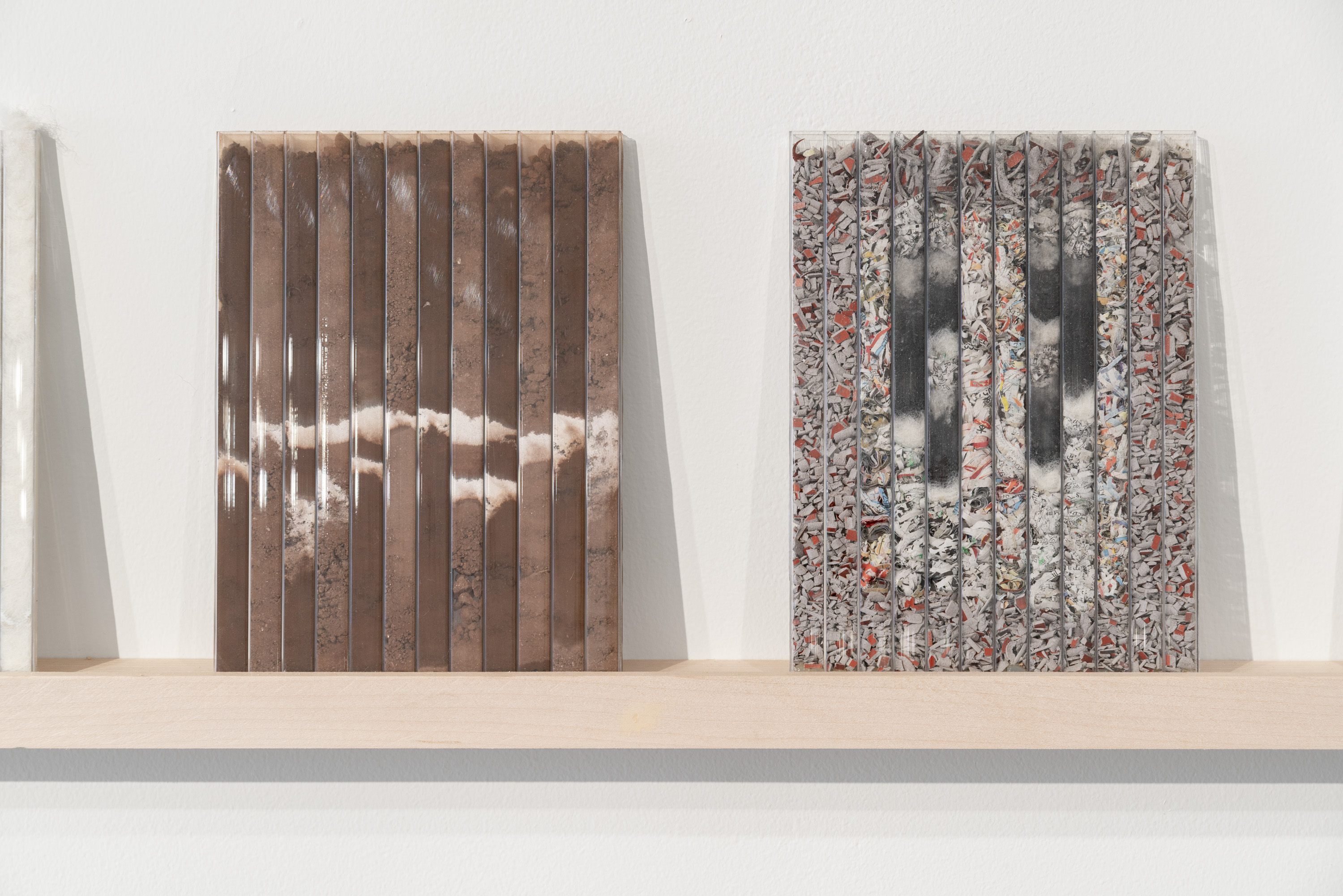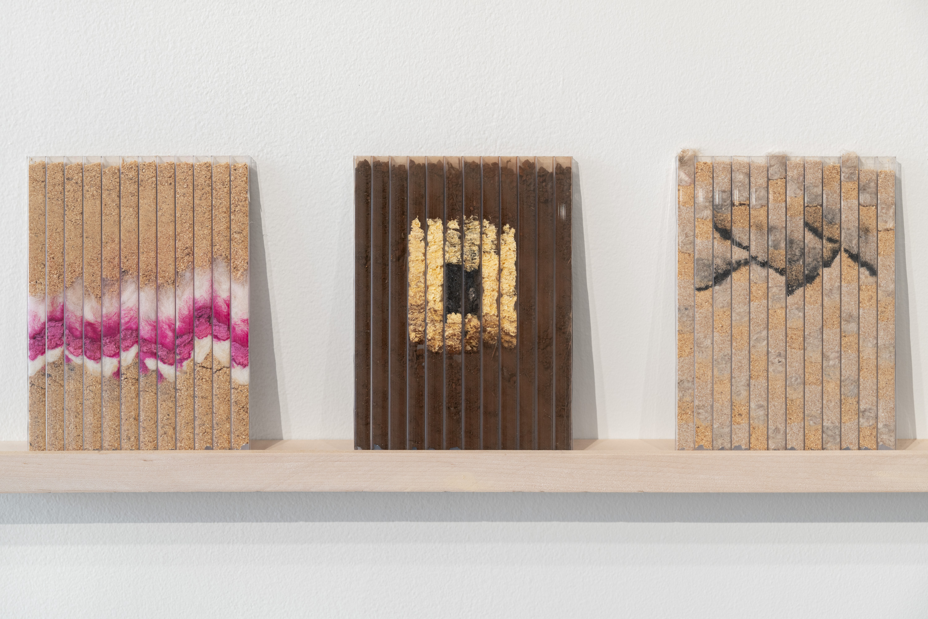 tract (Map & Key), 2025, sand, plaster, soil, rhodamine dye, wool, sponge, saw dust, thread, newspaper, linoleum, sunflower seeds, rust, pappus, bark, Chasmanthhium latifolium (northern sea oats), Ambrosiatrifida (giant ragweed), and calcium carbonate in polycarbonate panel, Dimensions: twenty-four 5 x 7 in. small tracts and one 48 x 48 in. large tract
