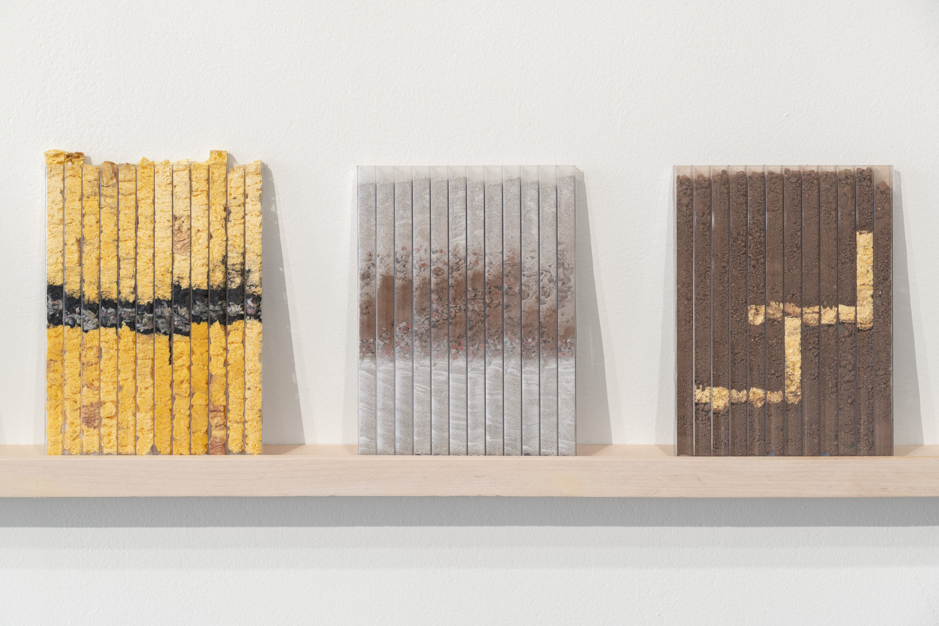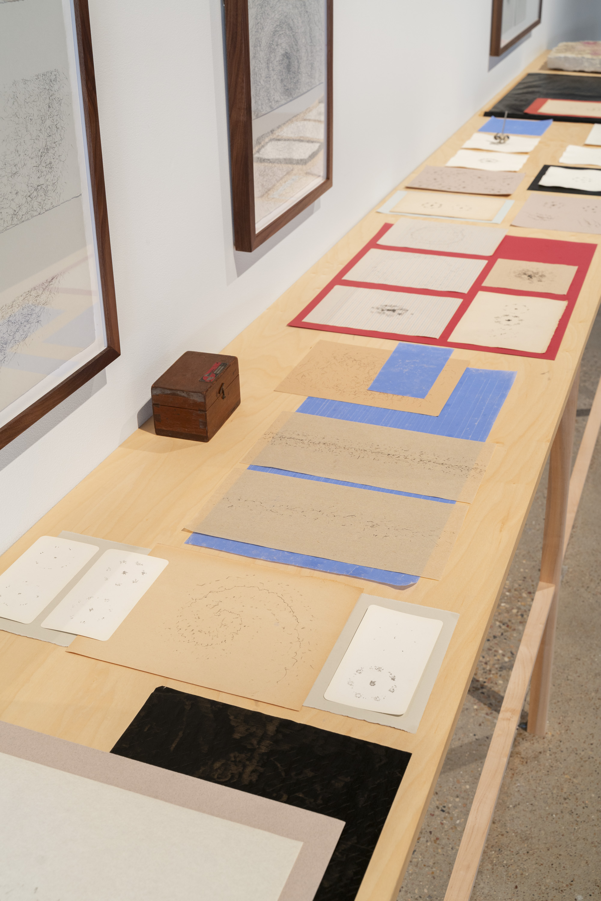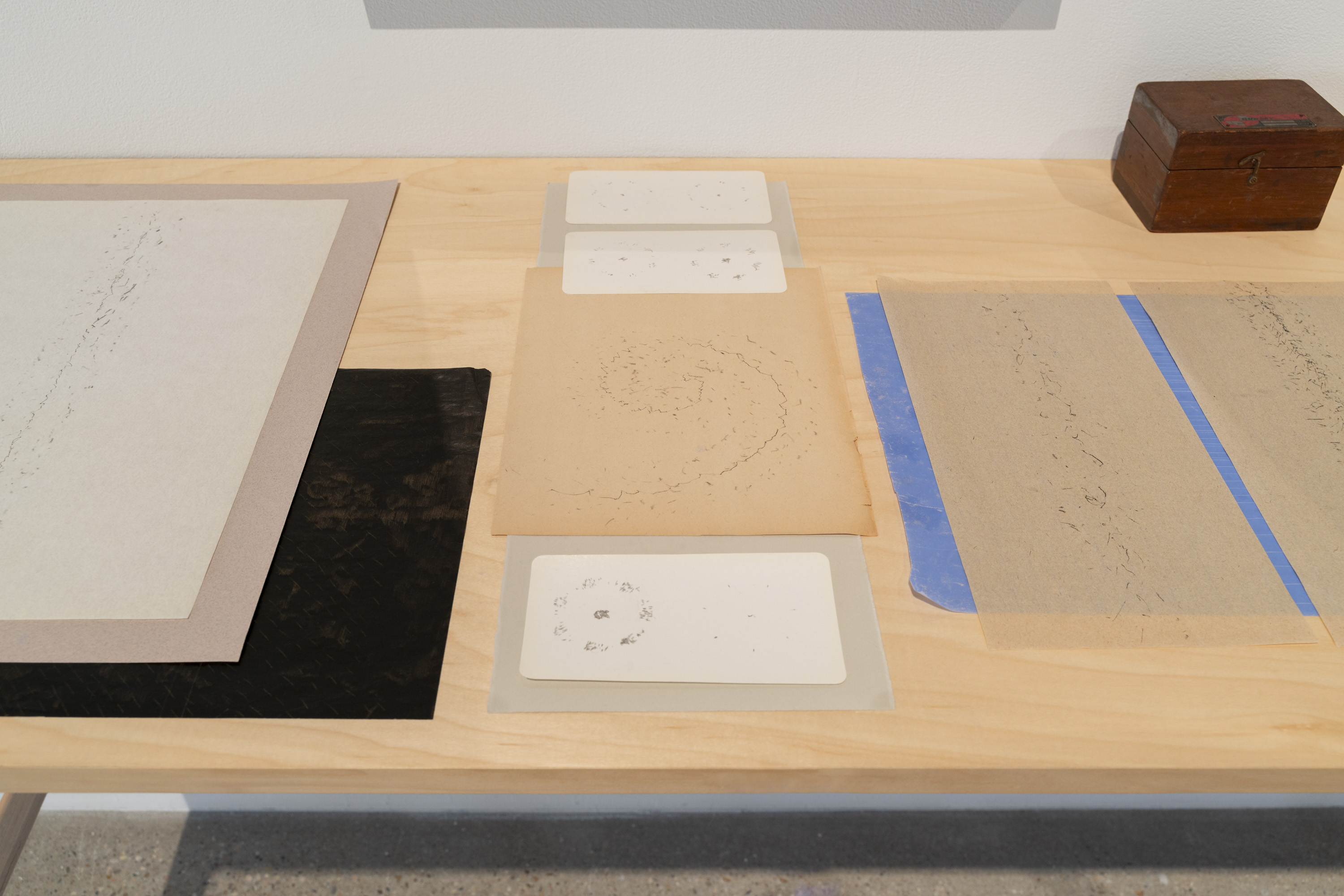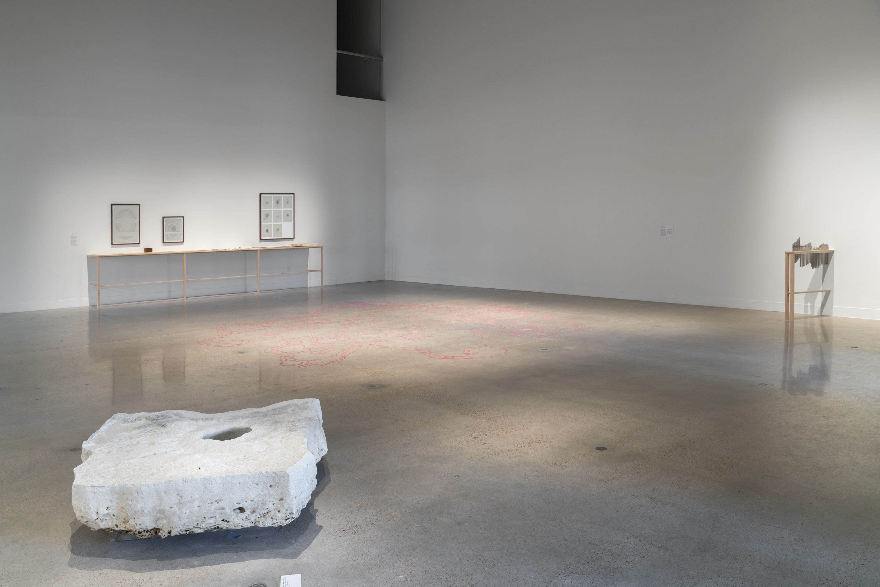 Across seven new bodies of work, Flanagan repurposes scientific and artistic tools, resisting a complete picture of the aquifer in favor of highlighting its fluid, ever-changing nature and the fragmented ways diverse groups perceive, protect, and give it meaning. Subtle changes in the gallery’s atmosphere further destabilize the works: gravity compresses layered sediment, humidity swells sand, and changing light patterns reveal and conceal details. In To Move Through Stone, Flanagan presents drawing as an expanded form to incorporate the methods, metrics, and emotions used across a range of disciplines to sit with the uncertainty of knowing, representing, and caring for this shared resource, which is increasingly at risk amid the climate crisis and rapid development.
