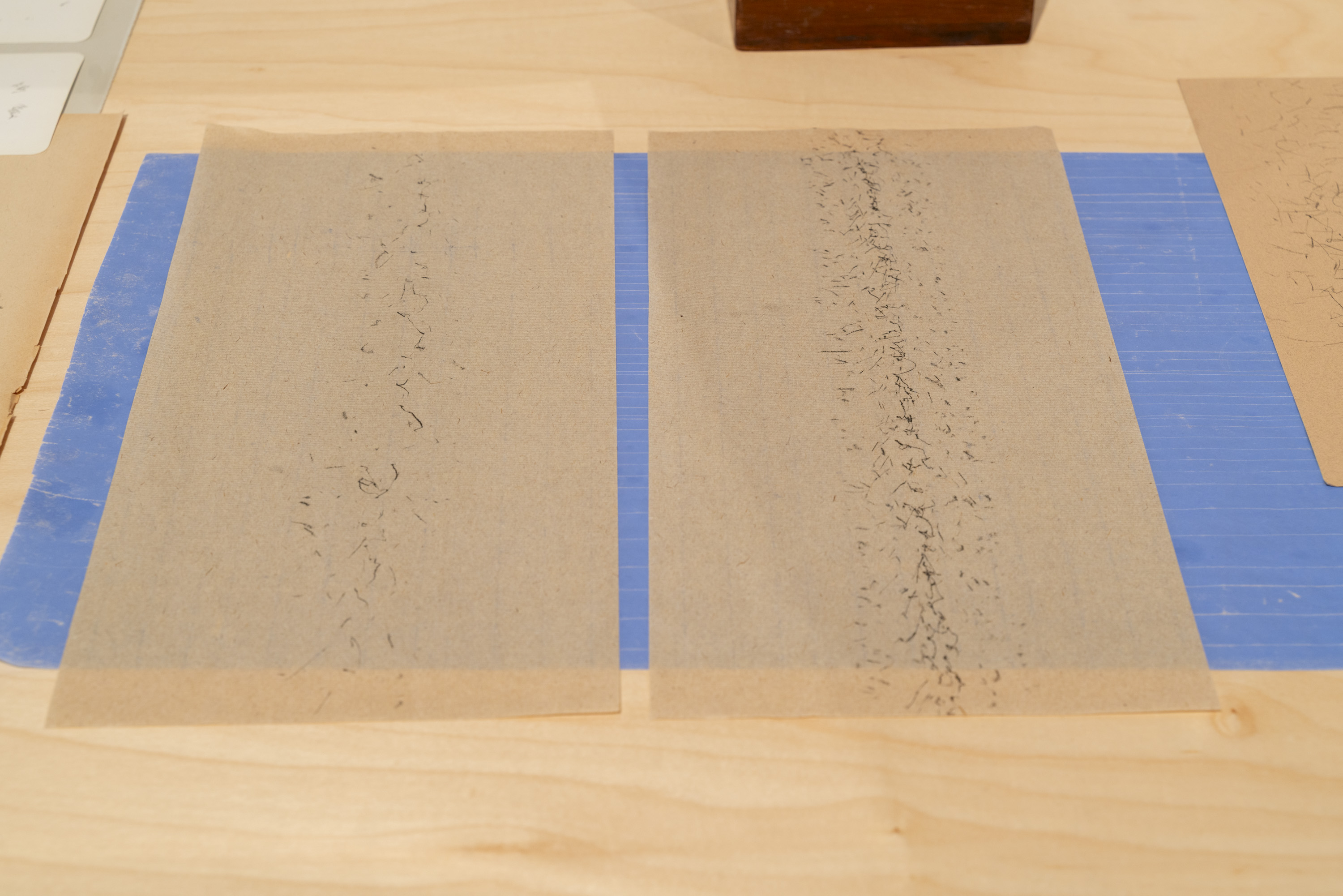 Well, 2025; Rock, 2025, transfer pigment on Arches paper, on maple wall, Dimension: 44 x 30 1⁄4 in. (drawings only)