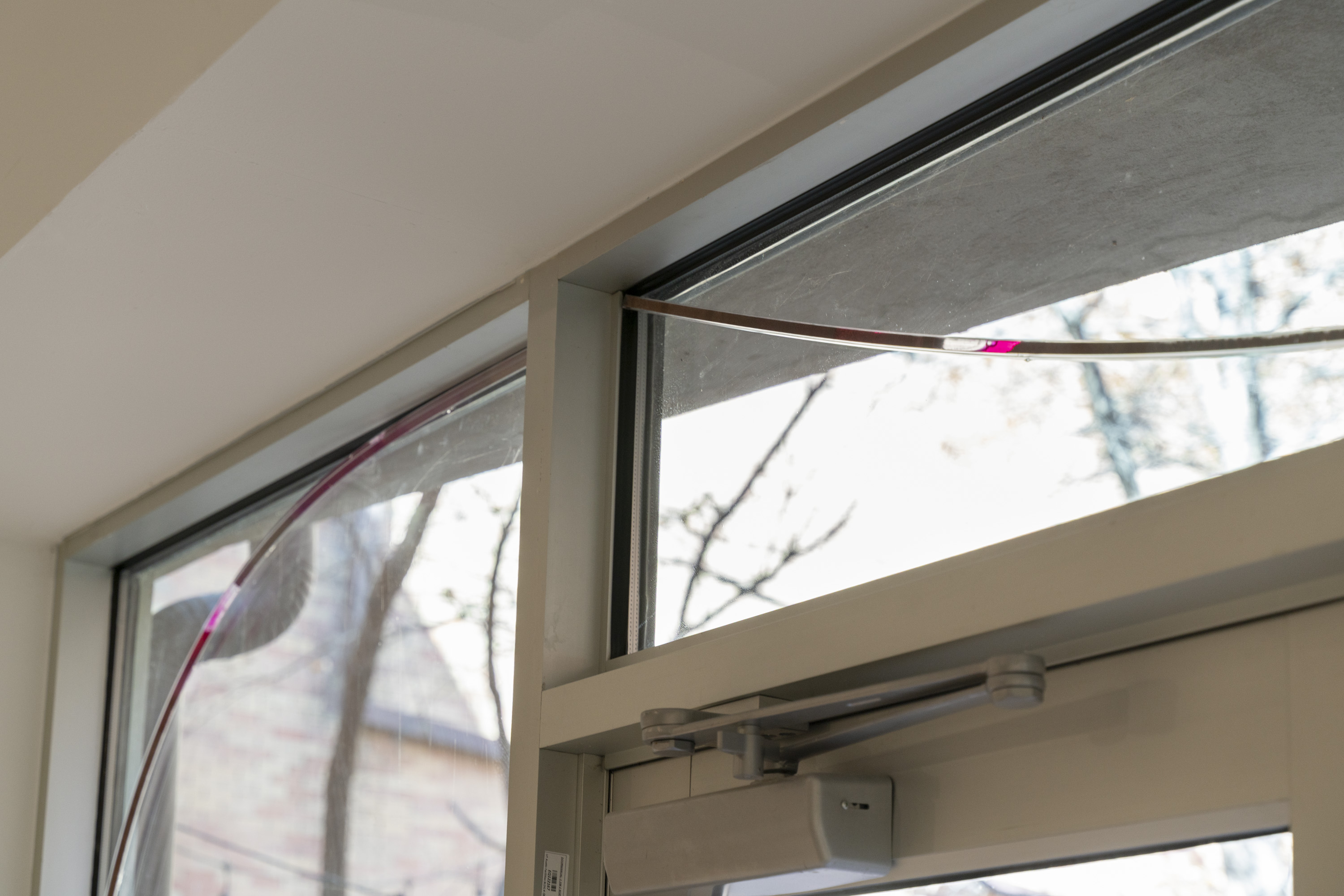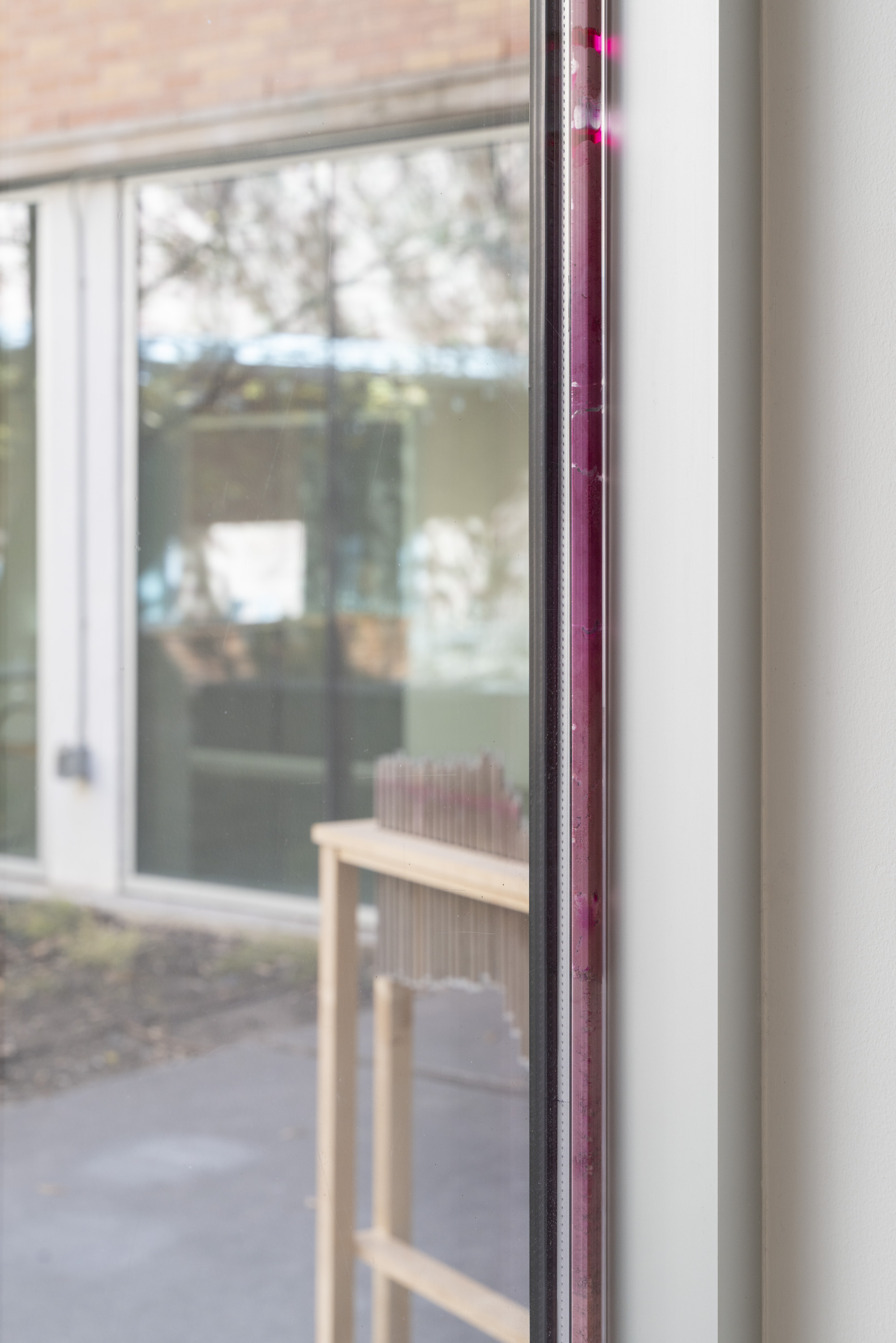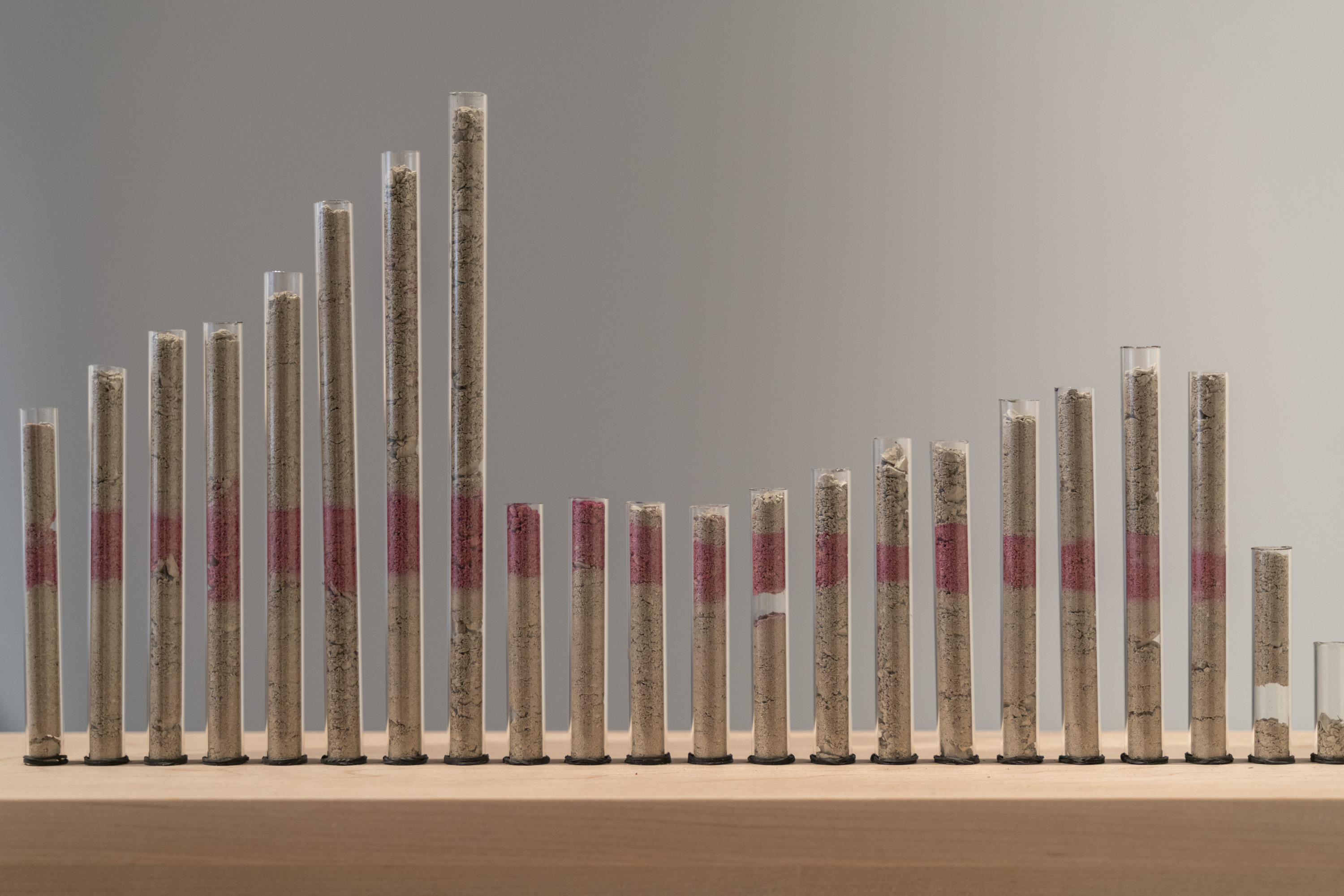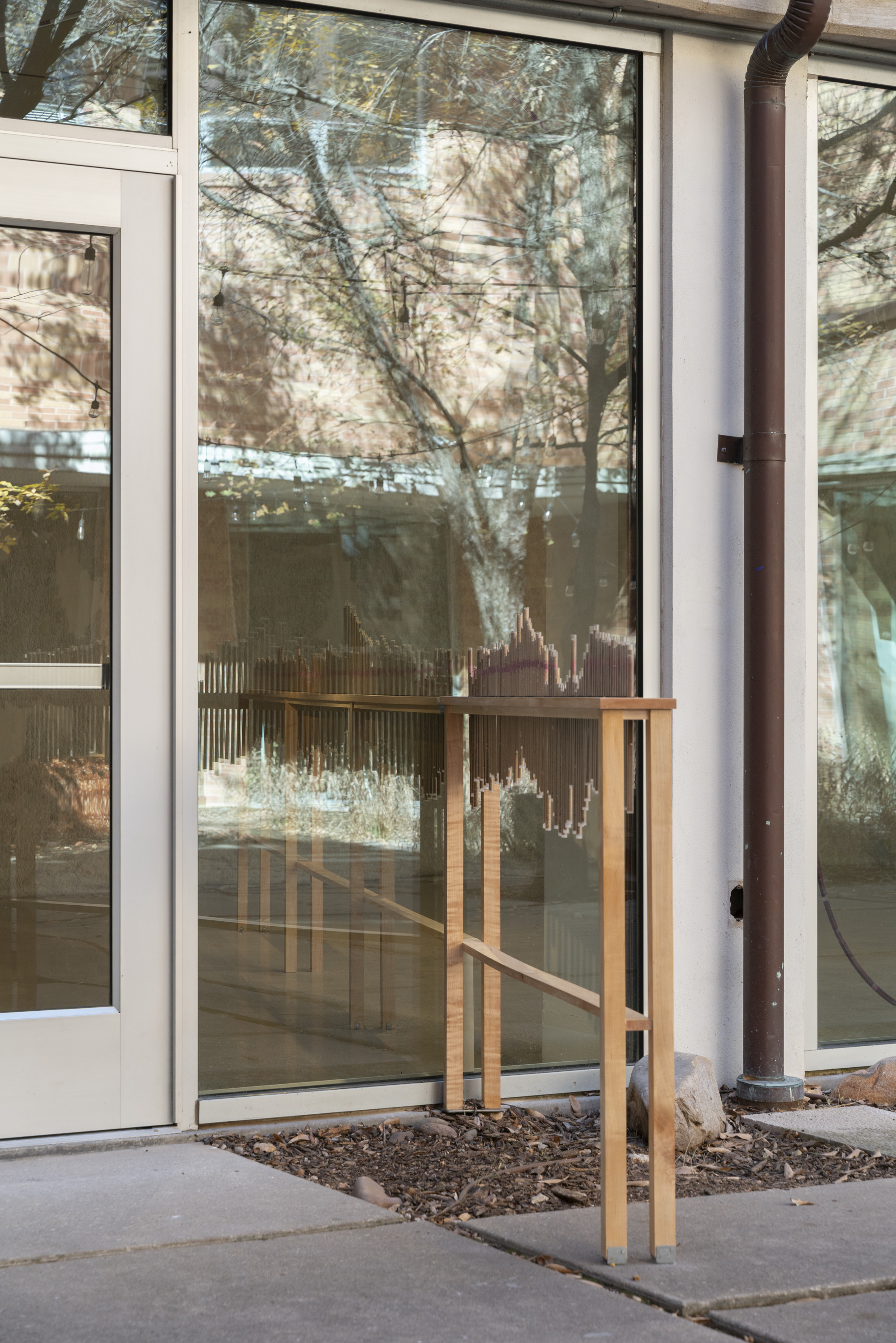 rain score, 2025, glass, limestone sediment, rhodamine dye, rubber bands, maple table, Dimensions: site-specific