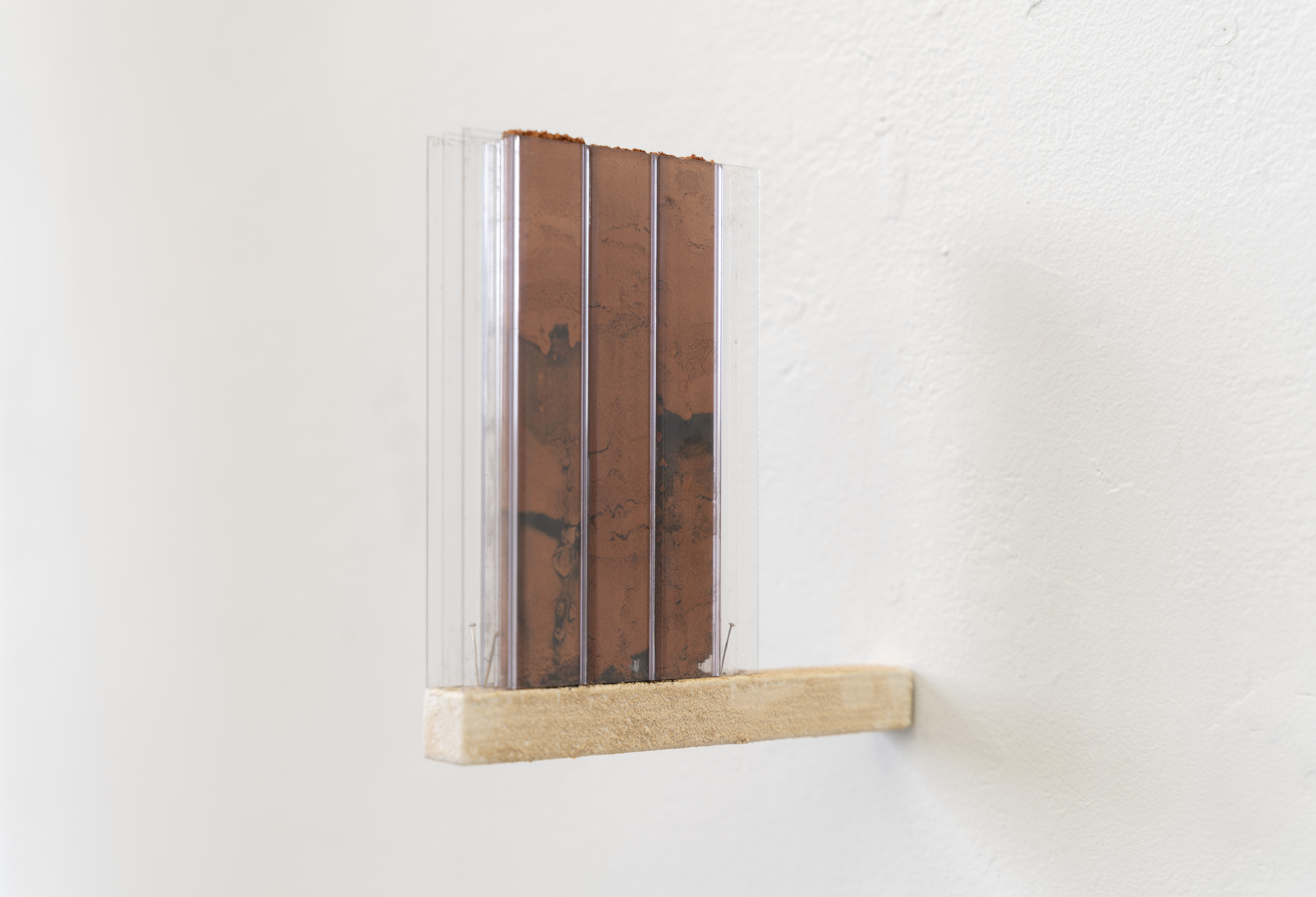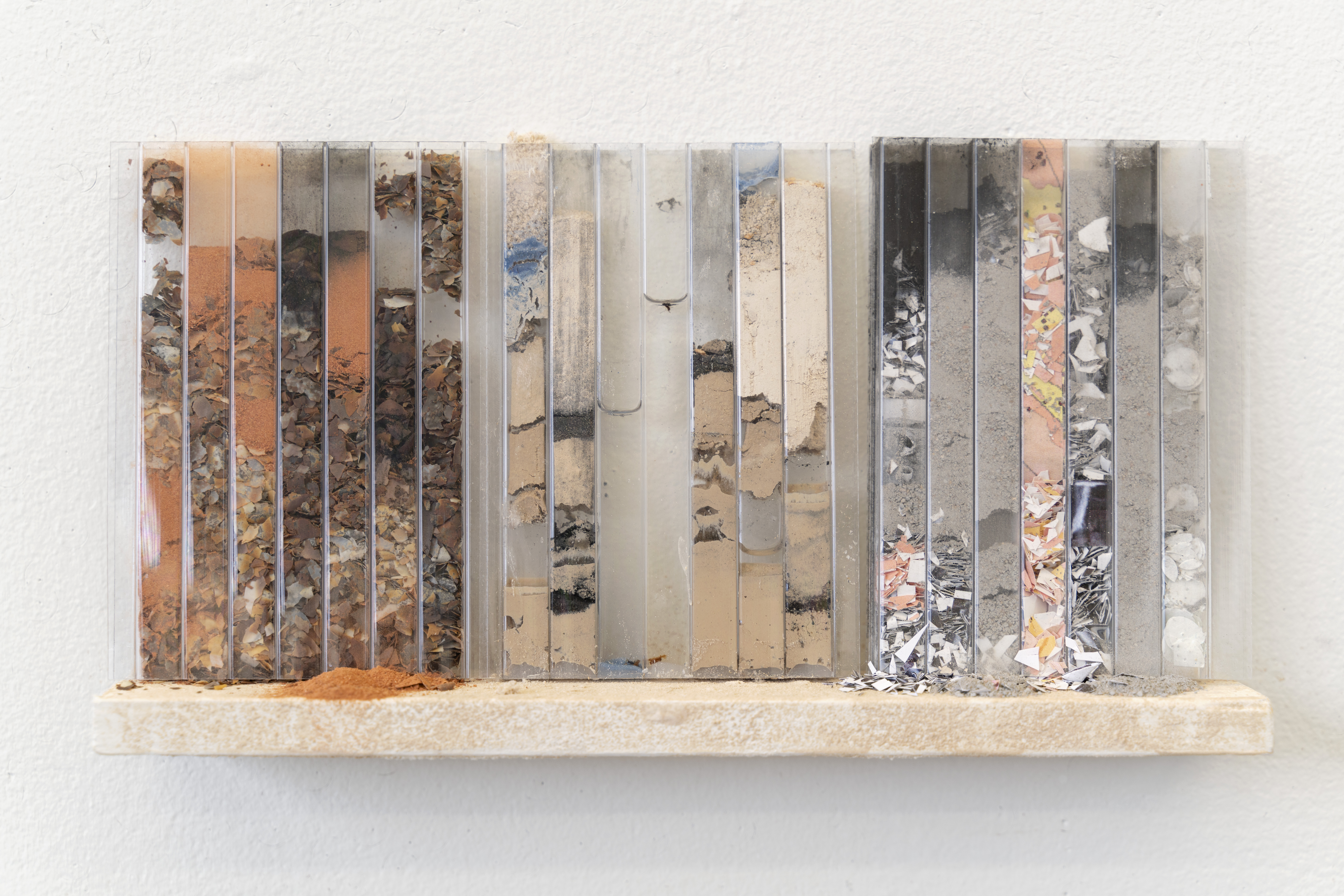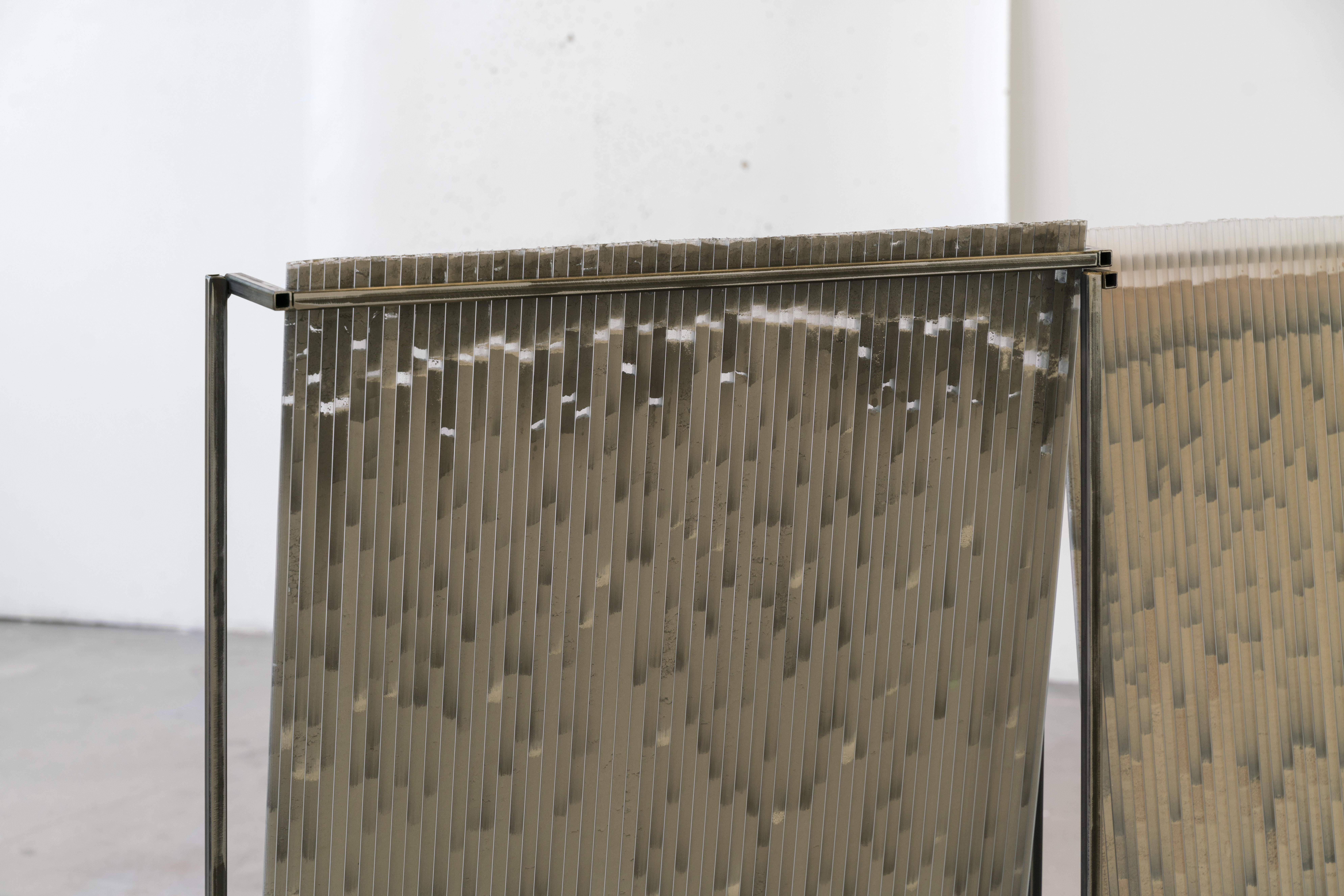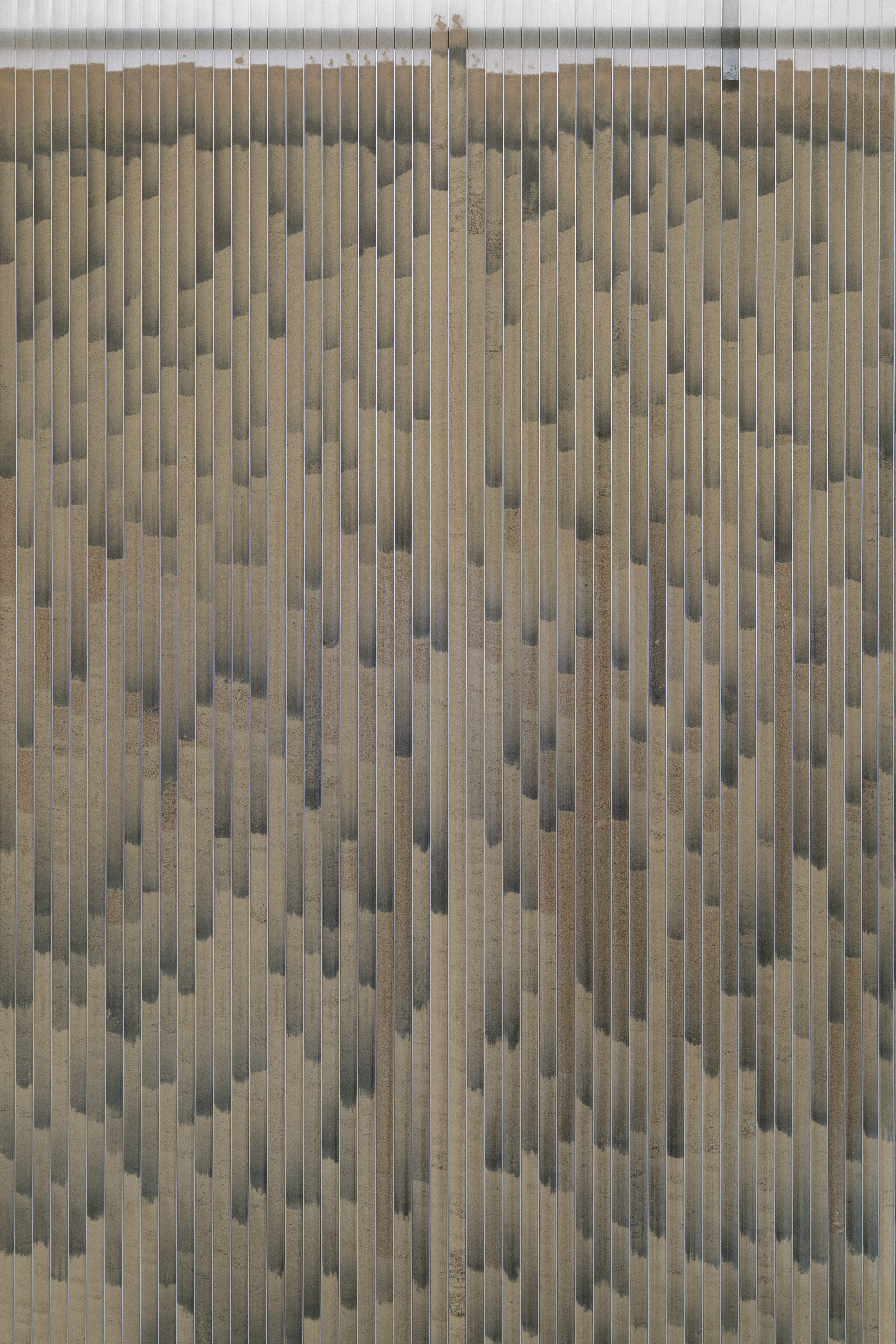 I make the series of works under the umbrella title ‘tracts’ by pouring granular material inside twinwall polycarbonate panels-- a building material commonly used for semi-transparent windows and walls. To make each ‘tract,’ I gather, sort, and pour granular materials inside the polycarbonate panels, which accumulates at the bottom of the channels, building up an image that evokes natural rhythms and phenomena.