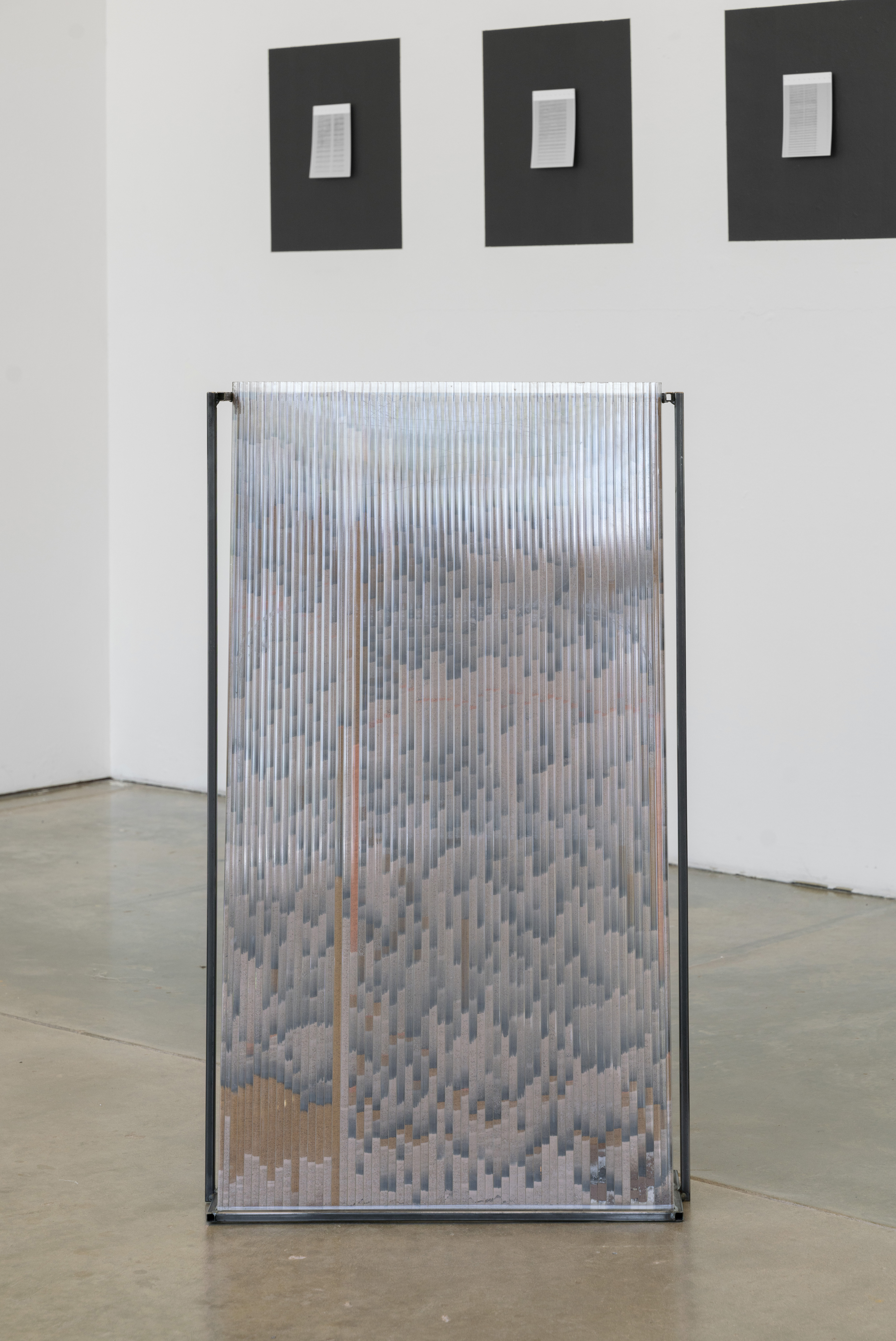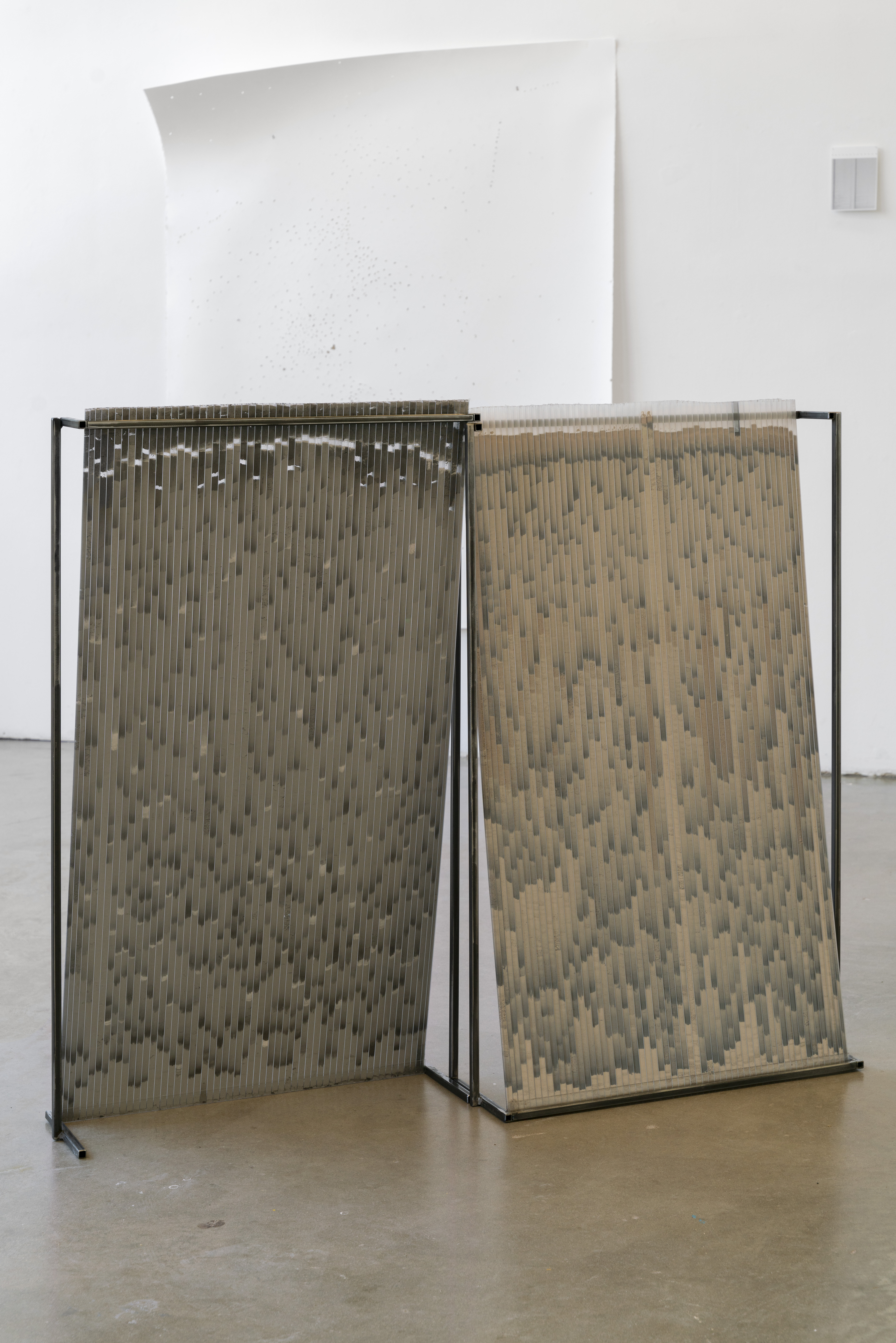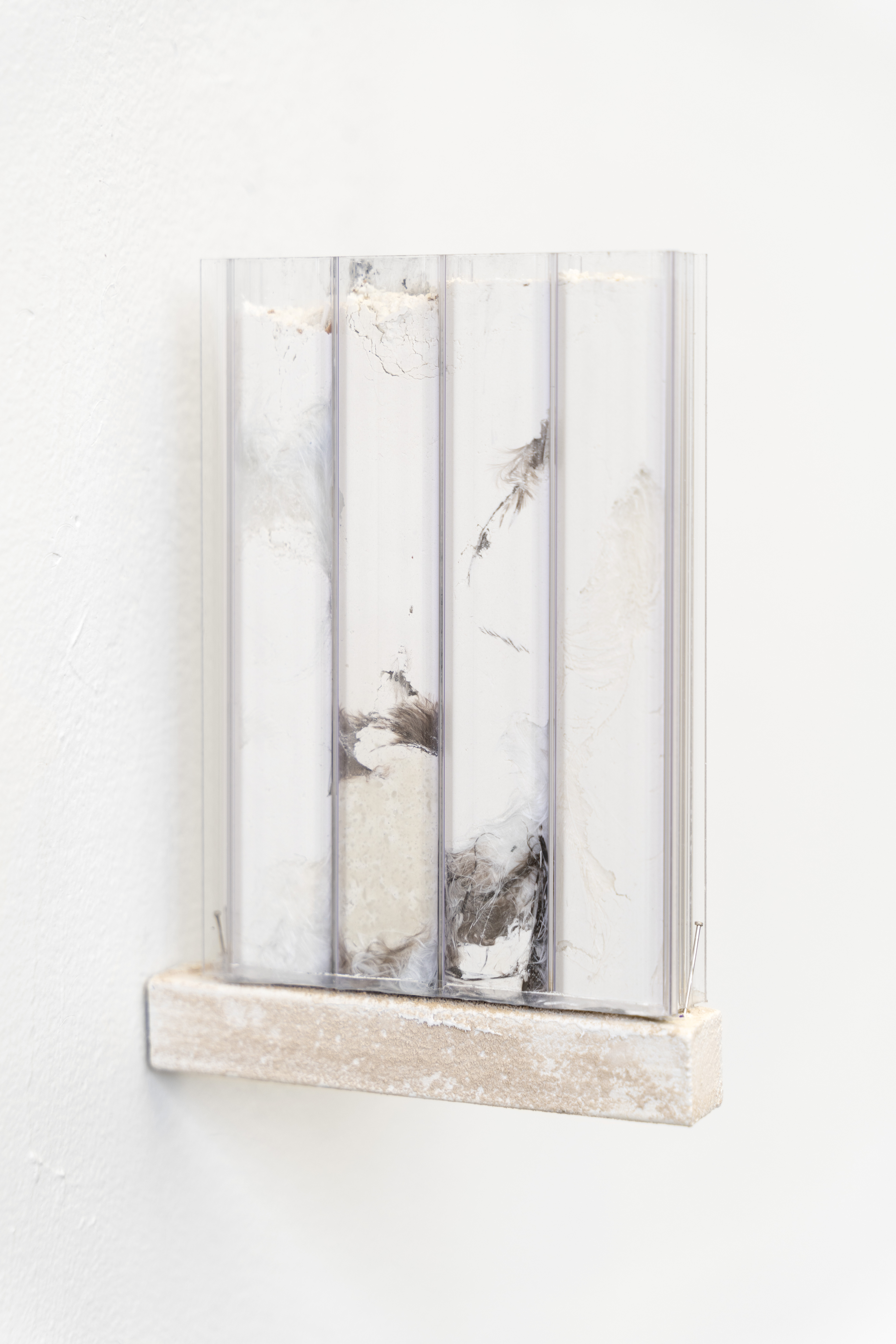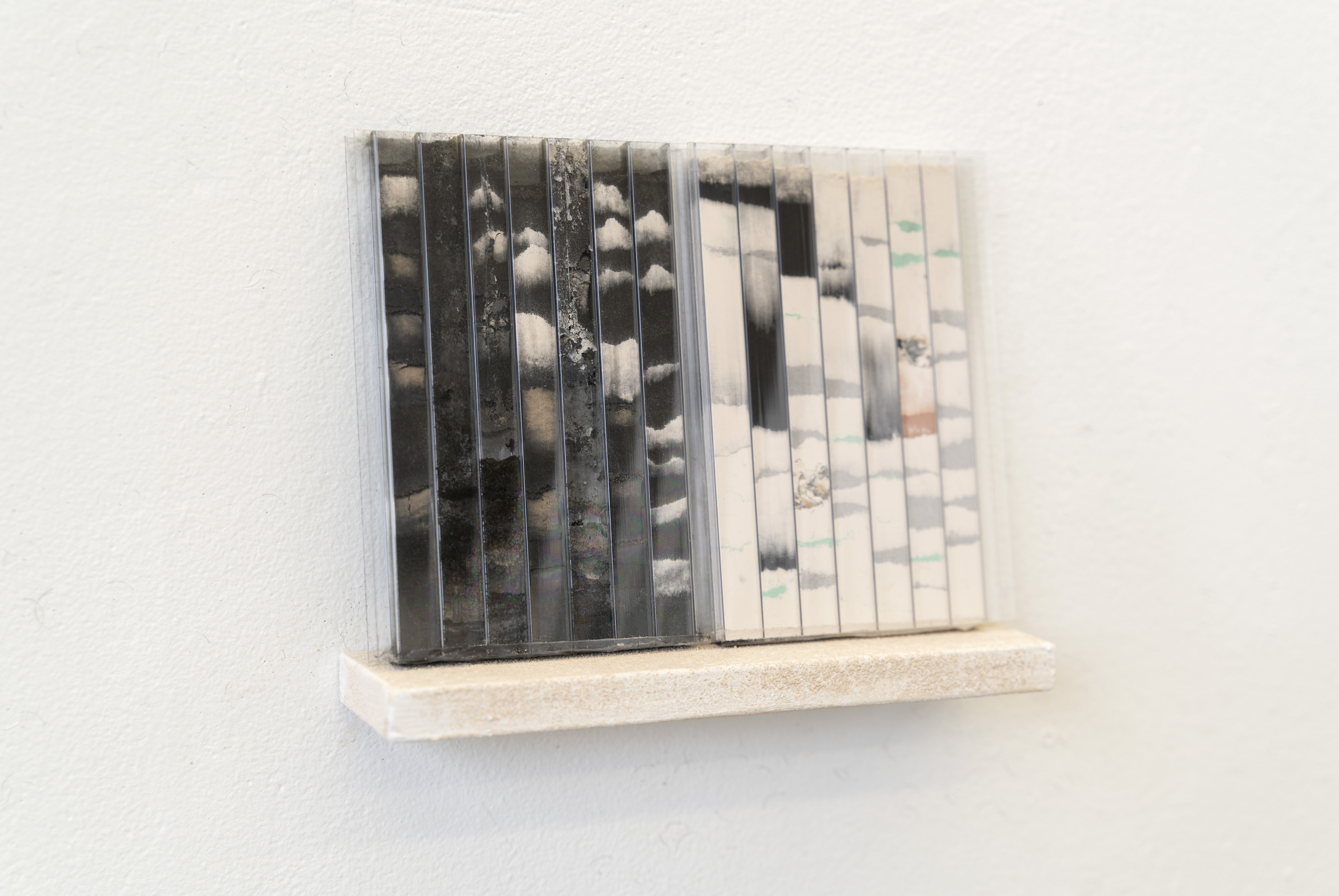 I make the series of works under the umbrella title ‘tracts’ by pouring granular material inside twinwall polycarbonate panels-- a building material commonly used for semi-transparent windows and walls. To make each ‘tract,’ I gather, sort, and pour granular materials inside the polycarbonate panels, which accumulates at the bottom of the channels, building up an image that evokes natural rhythms and phenomena.