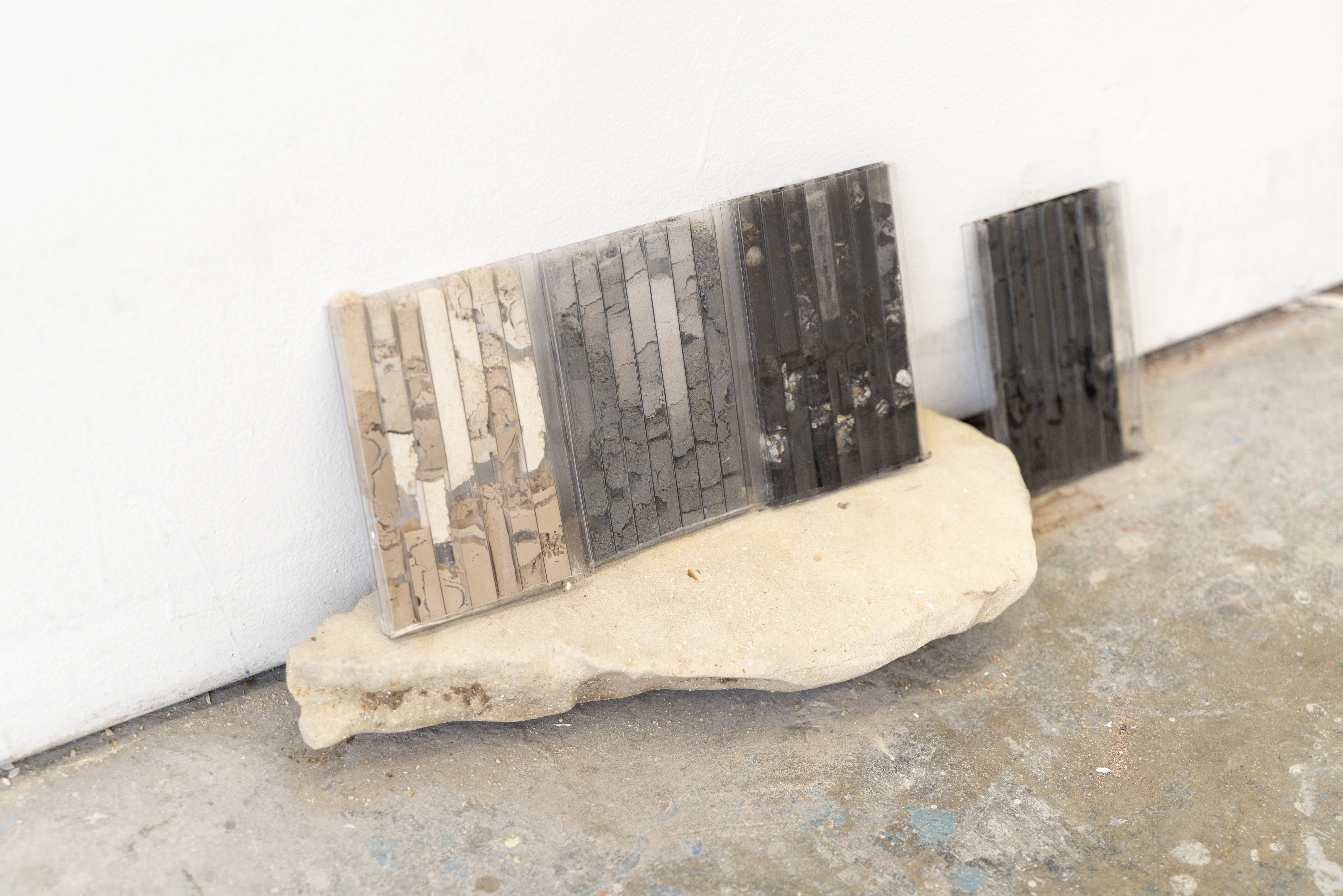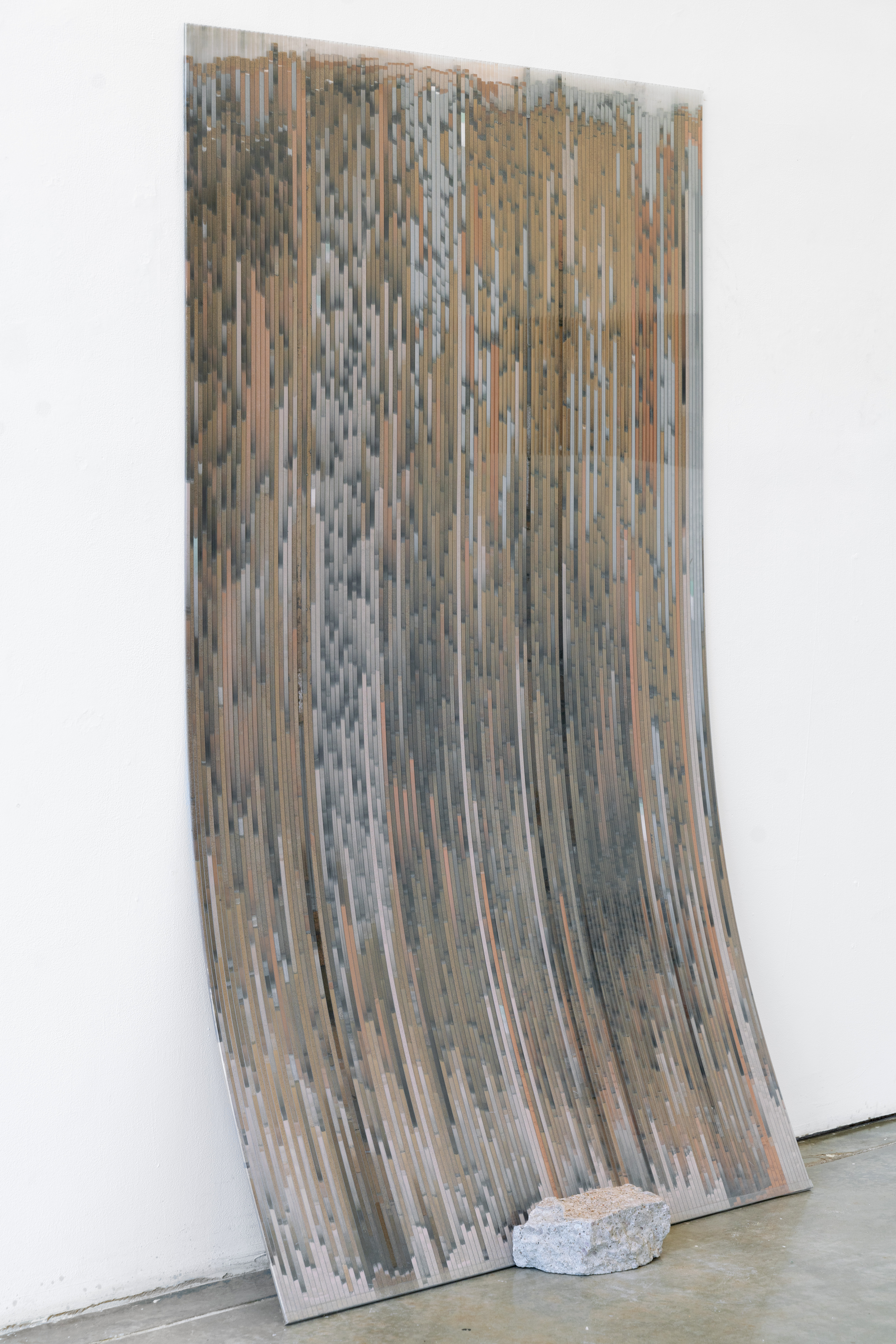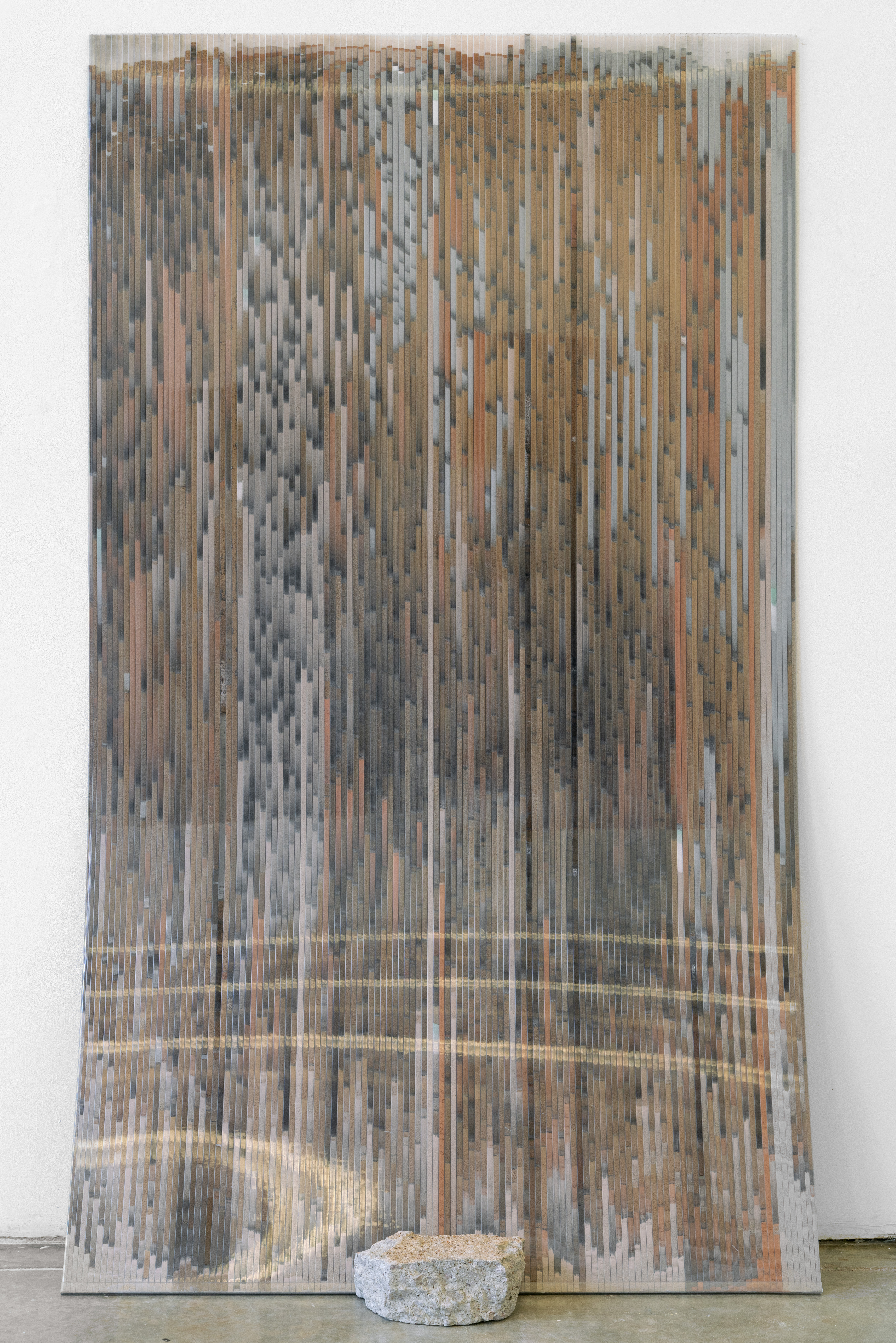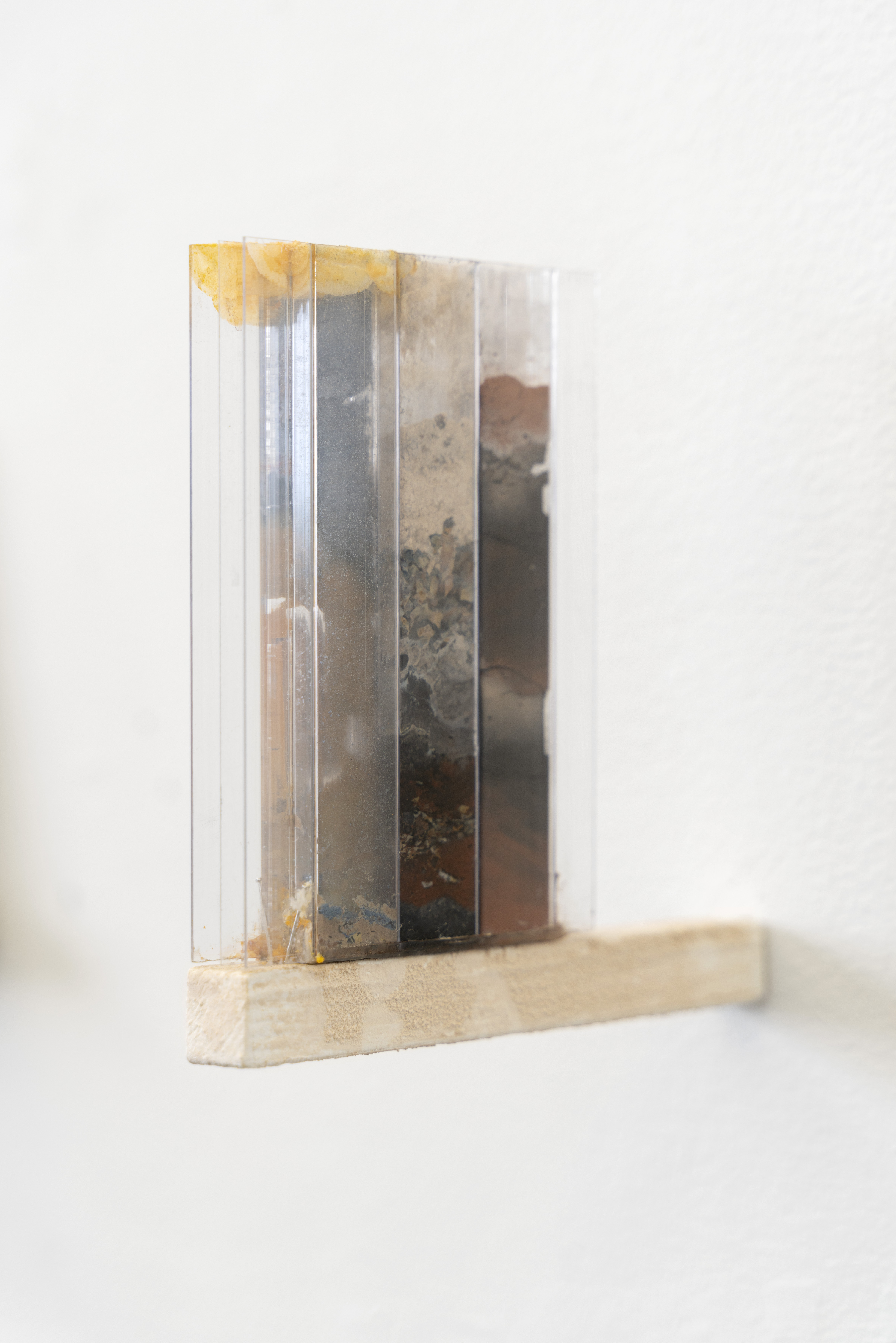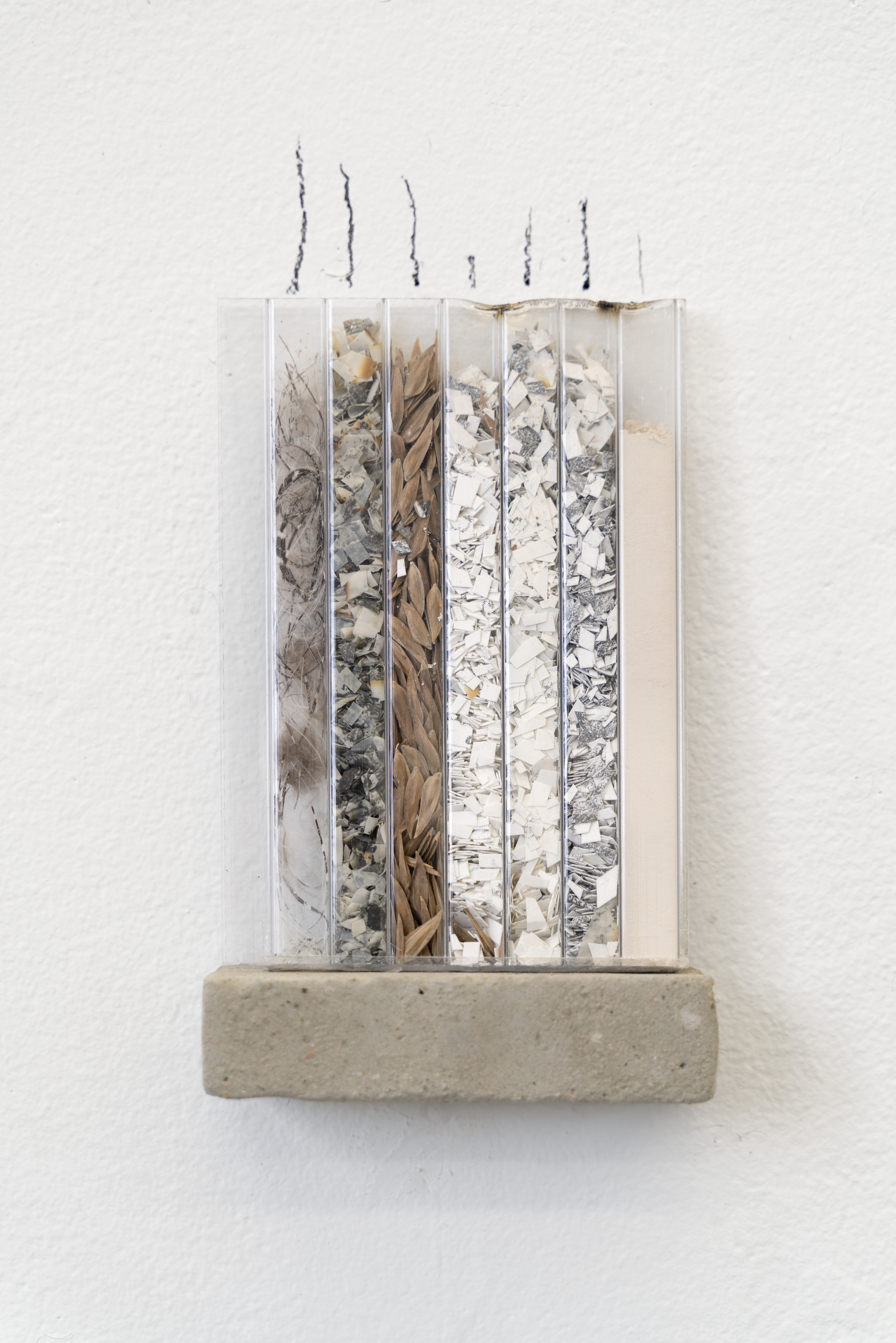 I make the series of works under the umbrella title ‘tracts’ by pouring granular material inside twinwall polycarbonate panels-- a building material commonly used for semi-transparent windows and walls. To make each ‘tract,’ I gather, sort, and pour granular materials inside the polycarbonate panels, which accumulates at the bottom of the channels, building up an image that evokes natural rhythms and phenomena.